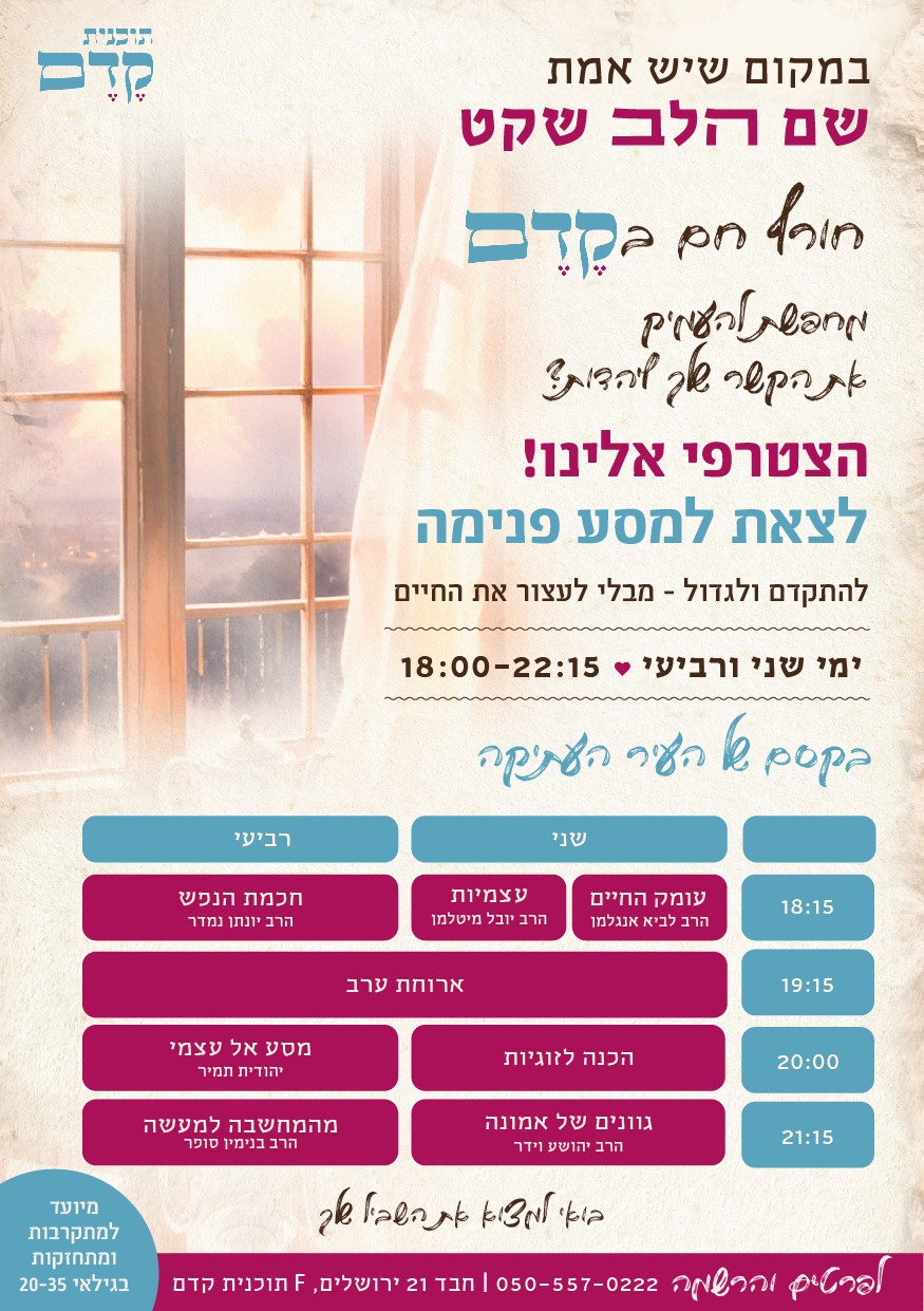 התוכנית תתקיים בע"ה בימי שני ורביעי תשפ"ו בין השעות 18:00-22:15
